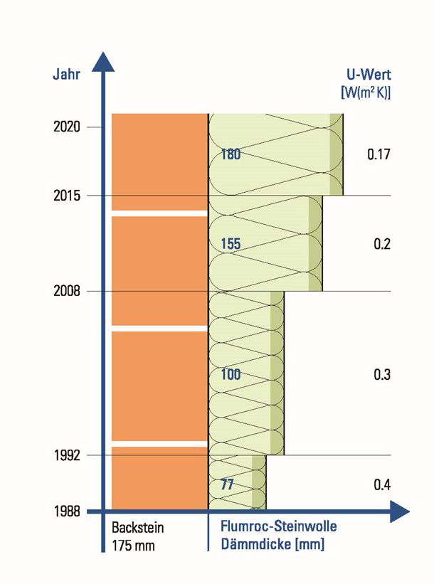 Genügte für eine Fassade mit Backsteinmauerwerk im Jahr 1999 noch eine Dämmstärke mit Steinwolle von durchschnittlich 80 Millimeter, fordert das Gesetz heute eine Dicke von 180 Millimeter. Der gesetzlich vorgeschriebene U-Wert für eine Fassade verschärfte sich in der gleichen Zeit von 0,4 W/m2K auf 0,17 W/m2K. Diese Werte gelten zwar für Neubauten. Daraus lässt sich aber der Handlungsbedarf bei älteren Immobilien erahnen: Die bis Ende der Siebzigerjahre errichteten Gebäude verfügen meist über keine energieeffiziente Dämmung der Gebäudehülle. Üblich waren damals lediglich lokal angebrachte Dämmmaterialien zum Schutz vor Kondenswasser. Etwas besser bestellt ist es um die Gebäude aus den Achtziger- und Neunzigerjahren. Aber auch diese verfügen meistens nur über wenige Zentimeter dicke Dämmschichten.
