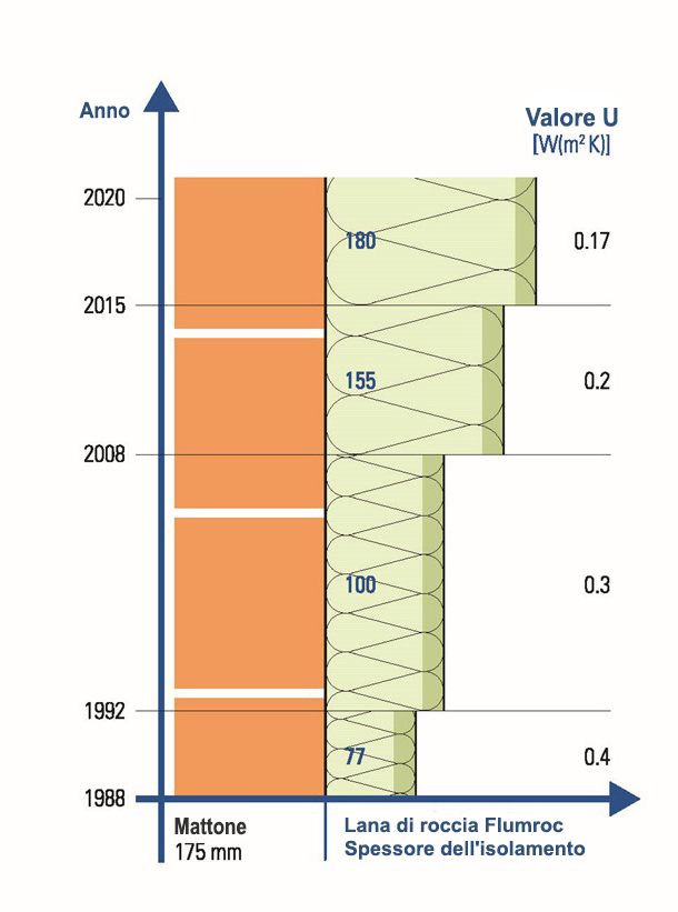 Se nel 1999 per una facciata con muratura in laterizi bastava ancora uno spessore isolante in lana di roccia medio di 80 millimetri, la legge richiede oggi uno spessore di 180 millimetri. Il coefficiente U prescritto per legge per una facciata si è inasprito aumentando nello stesso periodo da 0,4 W/m2K a 0,17 W/m2K. Questi coefficienti sono validi per le costruzioni nuove, ma lasciano presagire una necessità di intervenire sugli immobili più datati: nella maggior parte dei casi gli edifici costruiti sino alla fine degli anni Settanta del secolo scorso non dispongono di una coibentazione energeticamente efficiente dell’involucro edilizio. All’epoca si applicavano solitamente solo in determinati punti dei materiali isolanti per proteggere l’involucro dalla formazione di condensa. Gli edifici risalenti agli anni Ottanta e Novanta sono messi un po’ meglio. Ma anche questi ultimi sono nella maggior parte dei casi coibentati con materiali isolanti aventi solo pochi centimetri di spessore.