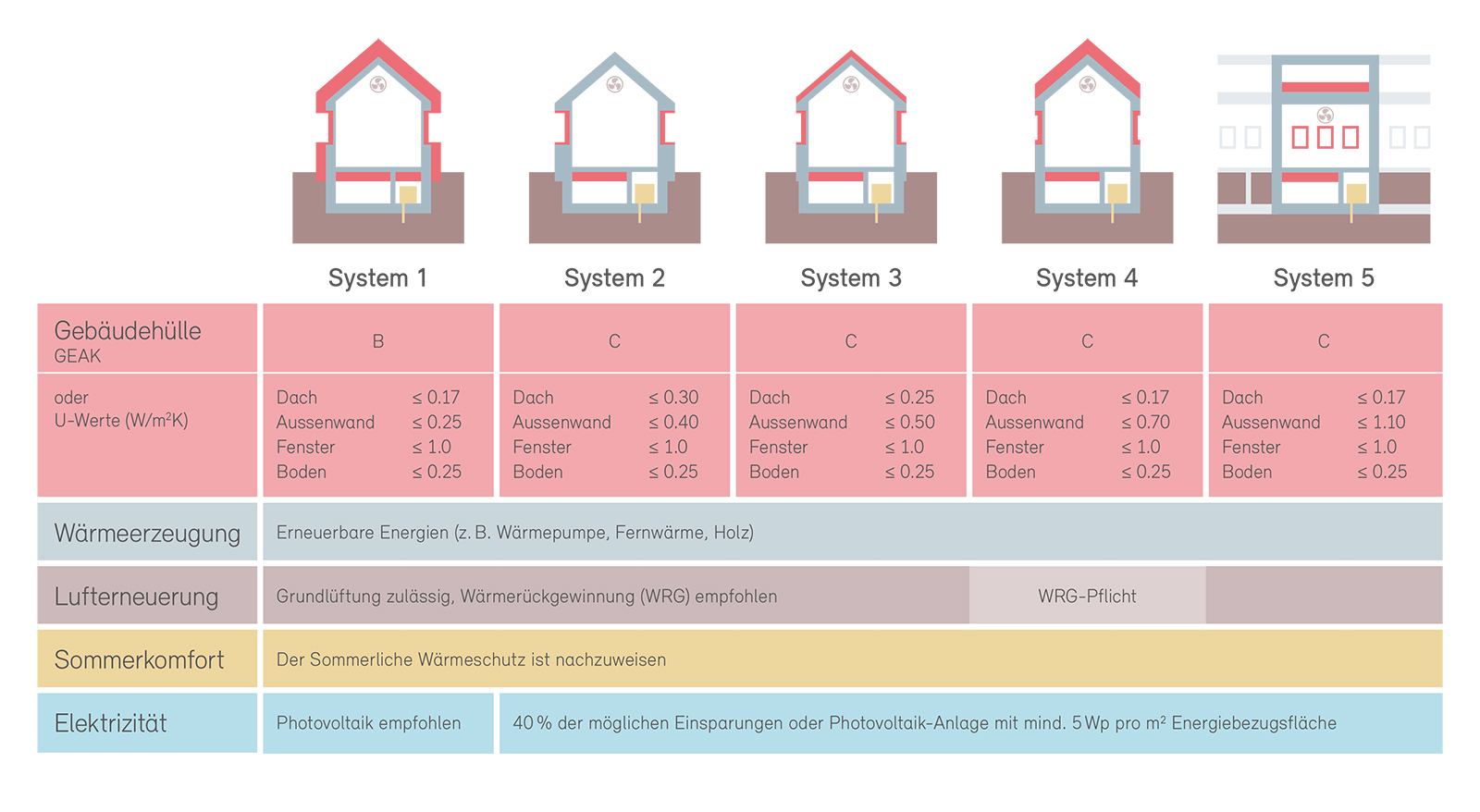 Mit der Minergie Systemerneuerung können Sie einfach ihr Gebäude modernisieren. Die fünf Varianten (Systeme) stehen je nach Gebäudetyp zur Auswahl und halten alle den gesetzlich geforderten Umbau-Grenzwert ein.
